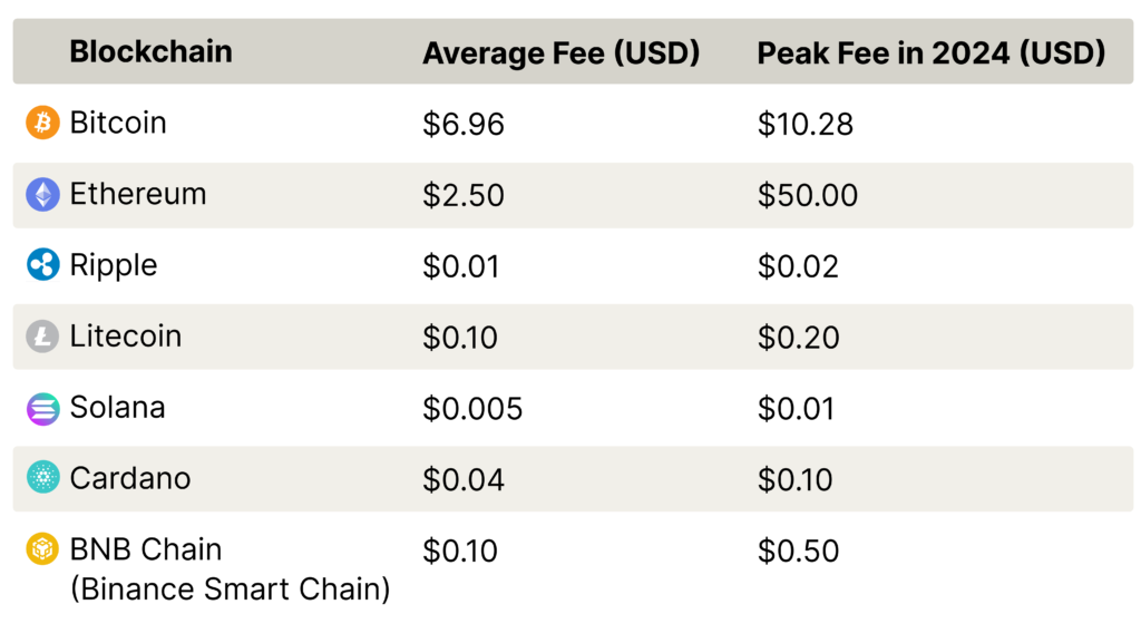 The following table shows the average crypto transaction fee per network in 2024, as well as the highest fee recorded throughout the year in USD.