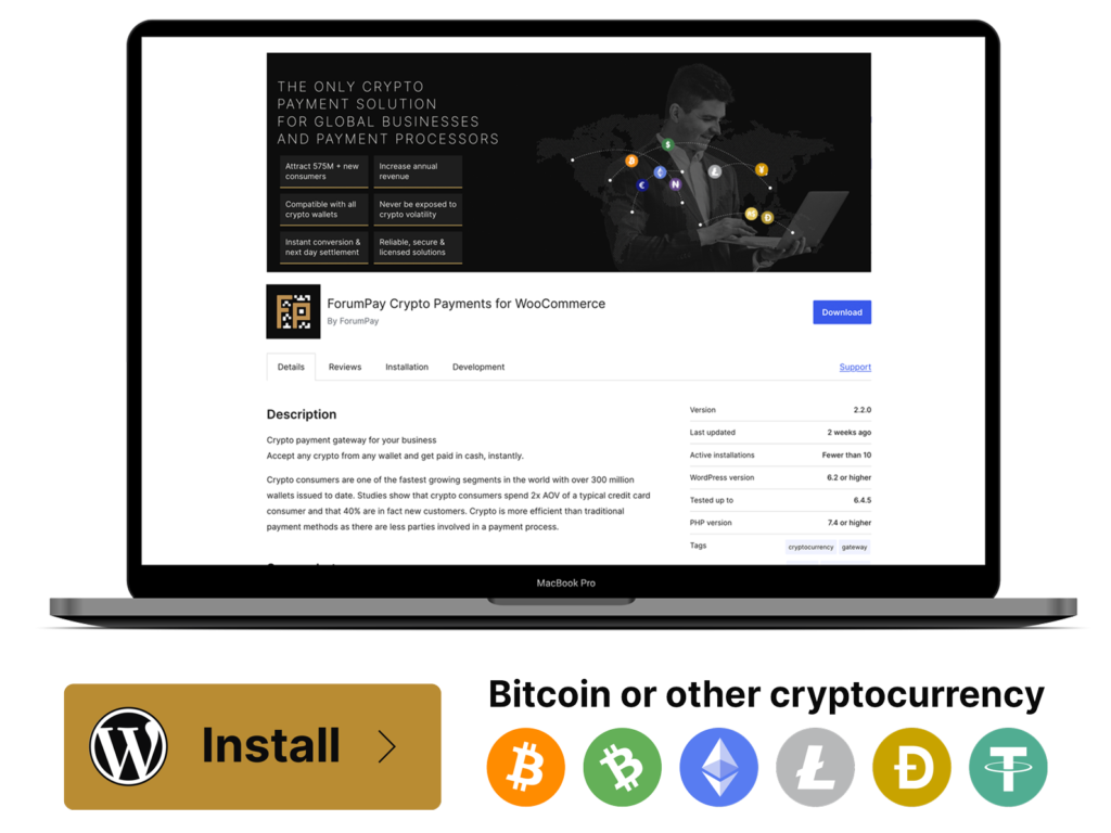 ForumPay offers a plugin for WooCommerce that enables businesses to accept cryptocurrency payments easily and securely. It instantly converts cryptocurrencies to fiat, ensuring quick settlements without volatility risks.